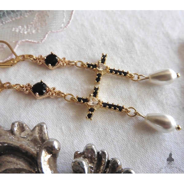 Paire de boucles d'oreilles de Reine façon Dark Romance avec pendentifs croix et perles.