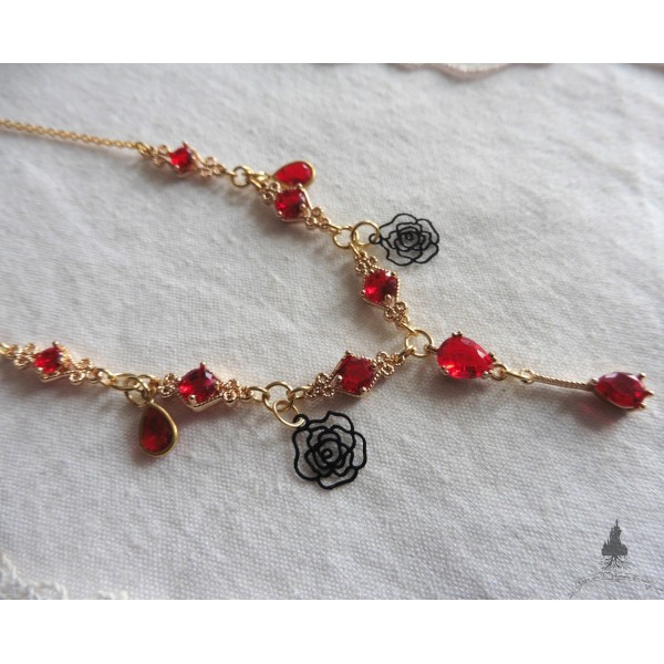 De chaque côté, deux fines breloques de roses en acier inoxydable noir très léger et deux mini gouttes en verre rouge serties sur du laiton doré.