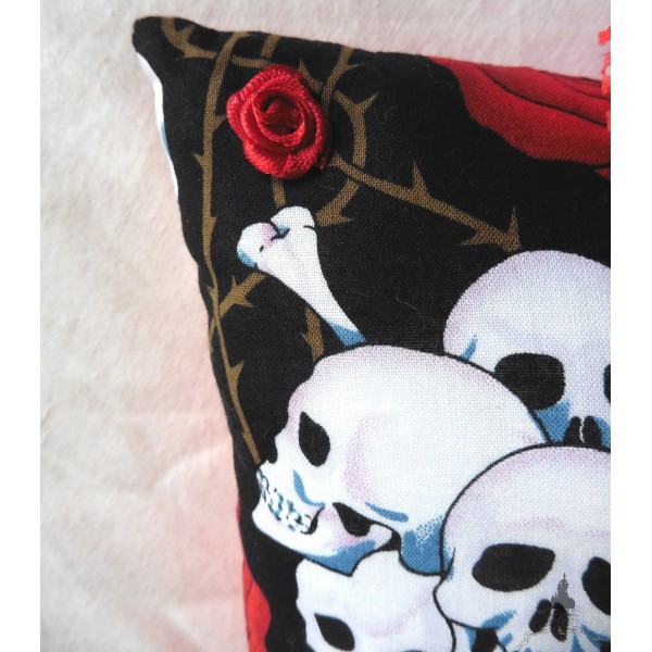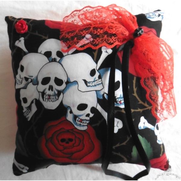 Coussin d'alliances réalisé en coton imprimé crânes blanc et roses rouges avec feuilles vertes sur fond noir.