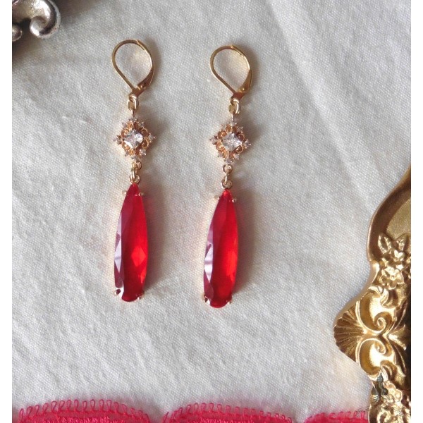 Boucles d'oreilles pendantes Art Déco Losanges Larmes rouge or, Gouttes, Reine, Renaissance, Cottagecore, Victorien