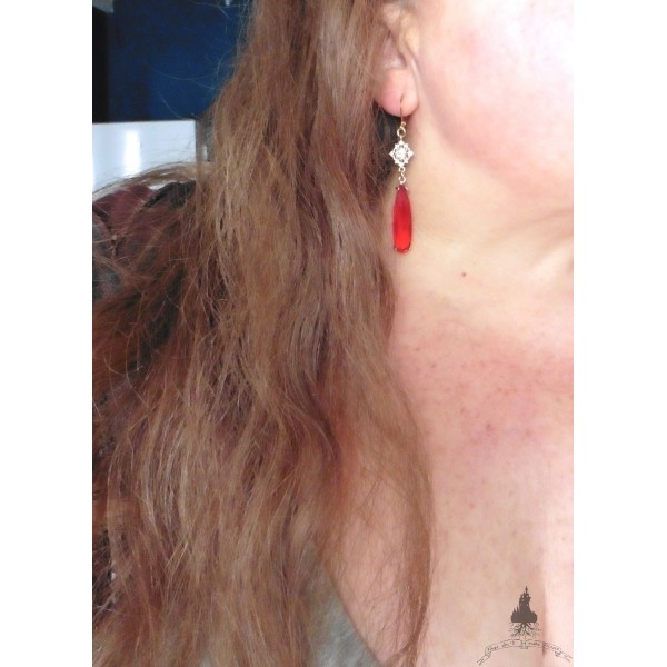 Larmes de verre rouge transparent, serties sur griffes en laiton doré.