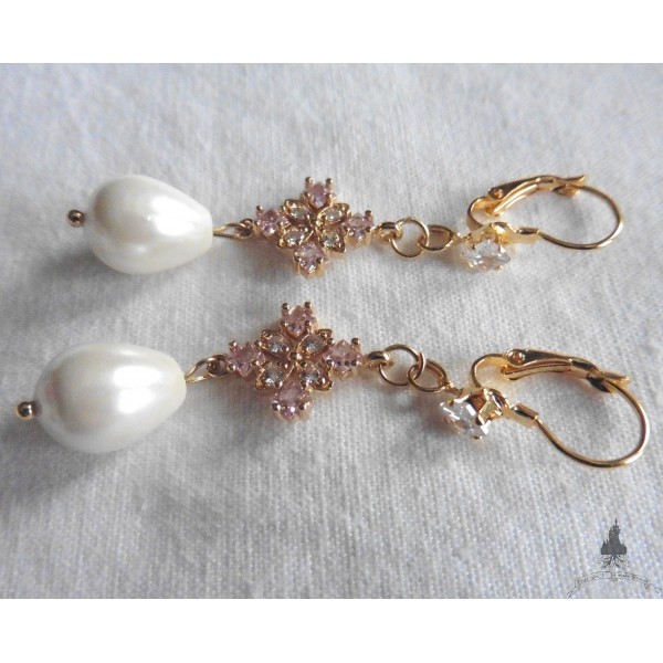 Pendentifs losanges Renaissance en Laiton doré pavé de zircons cubiques roses clairs et de petits oxydes de zirconium blancs formant une fleur au centre.