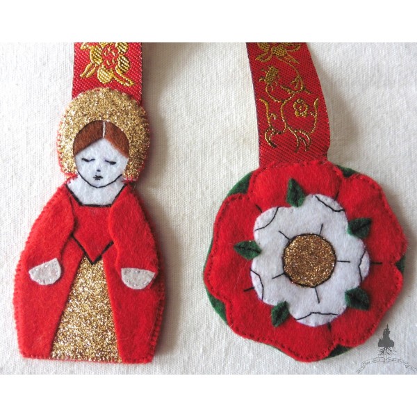Reine Tudor et rose Tudor en feutrine rouge, vert, blanc et or.