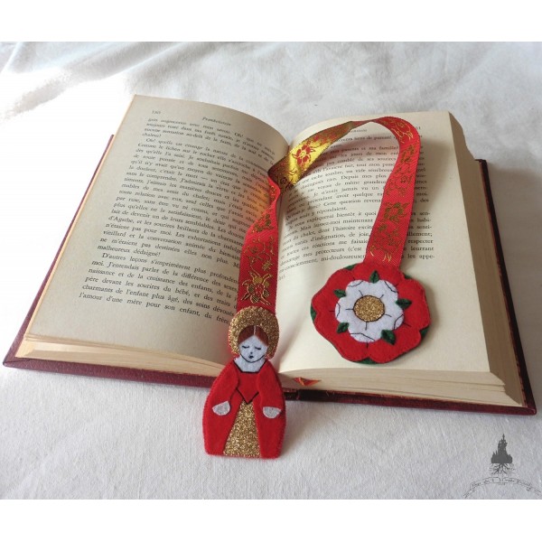 Marque-page textile avec ruban médiéval en polyester floral rouge et or avec l'envers en négatif doré.