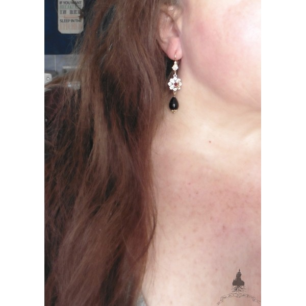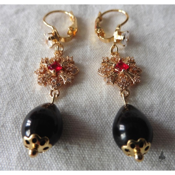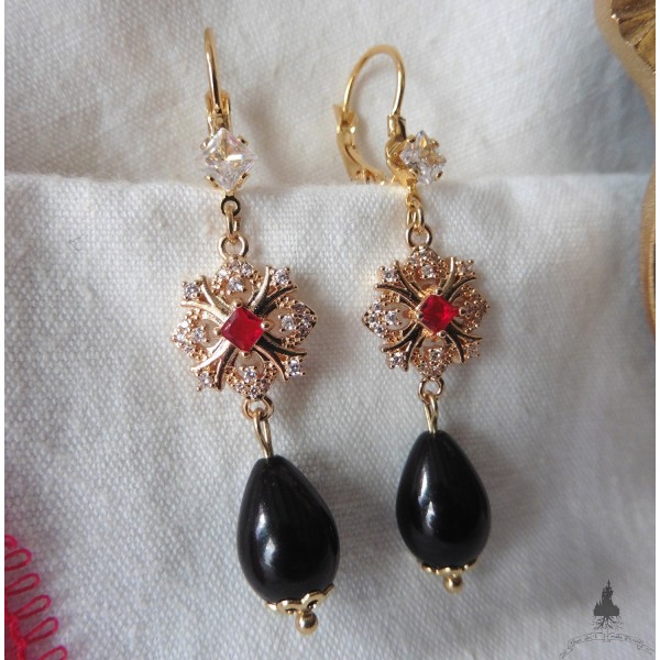 Paire de boucles d'oreilles royale, mais discrète, avec pendentifs Renaissance, pour cadeau, cérémonie ou mariage rouge, noir et blanc.