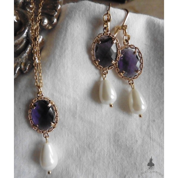 Pendentifs ovales avec bases en Laiton doré torsadé et cabochons ovales en verre à facettes violet transparent. Deux perles-gouttes en verre blanc écru/ivoire, nacrées synthétiquement.