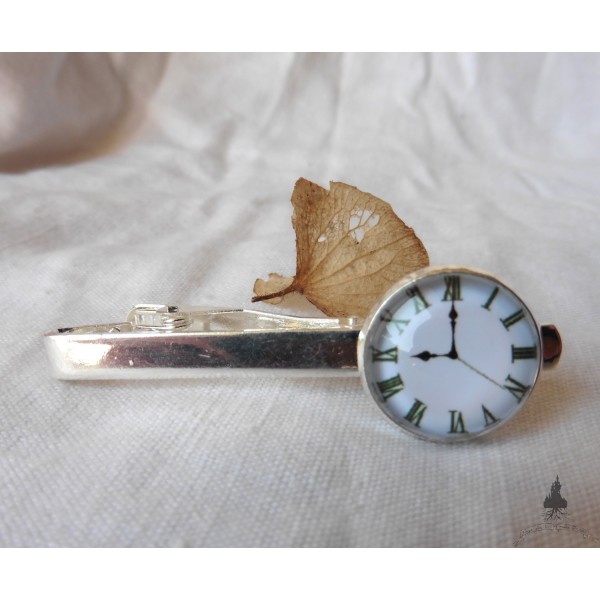 ♥ Pince à cravate pour Dandy élégant et Steampunk en métal argenté avec cabochon horloge en verre ♥