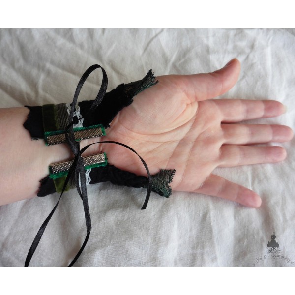 Grand bracelet manchette fait de de coton noir brodé et de dentelles vert foncé et blanche. Velours kaki et vert.