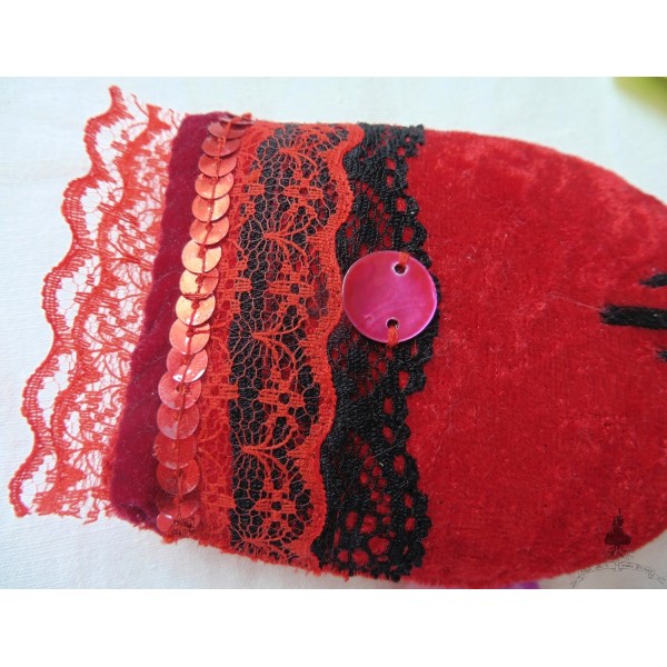 Quelques sequins rouges, une pièce de nacre teintée et un strass rose sur le haut parfont l'ensemble.