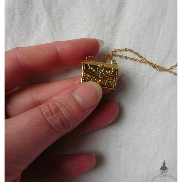 Collier ajustable avec chaîne en acier inoxydable doré et pendentif médaillon enveloppe en Laiton plaqué or.