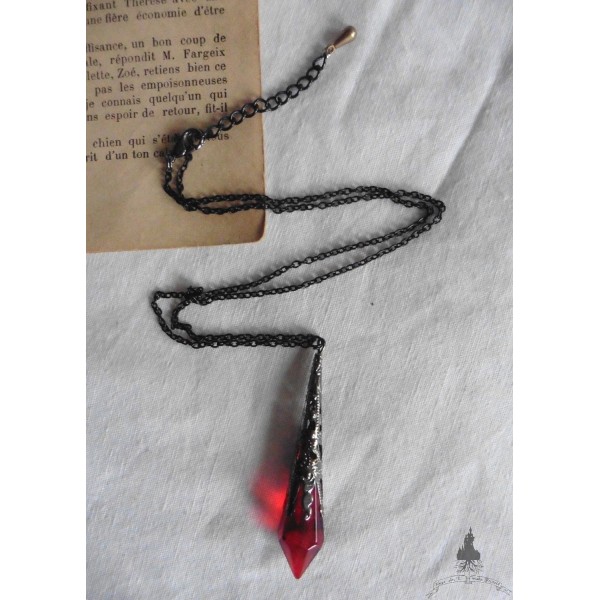 Pendentif prisme en VERRE rouge avec cône filigrané en métal anthracite vieilli (alliage de zinc).