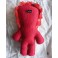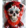 Réalisée en coton rouge imprimé crânes, os et roses. Tête cernée de dentelle rouge.