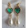 Petits pendentifs coeurs en verre vert à facettes sertis sur Laiton doré. Perles-gouttes en coquille nacrée synthétique.
