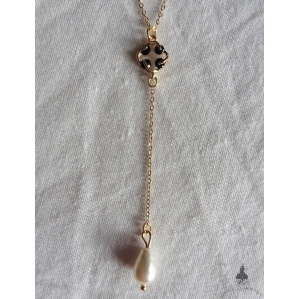 Délicat collier lariat en Y façon petit chapelet avec pendentif entrelas celtique médiéval et perle.