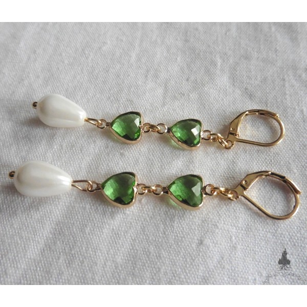 Petits pendentifs coeurs en verre vert clair de coloris "péridot" ou "olivine" à facettes sertis sur Laiton doré. Perles-gouttes en coquille nacrée synthétique.
