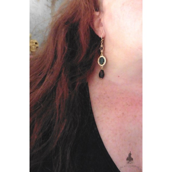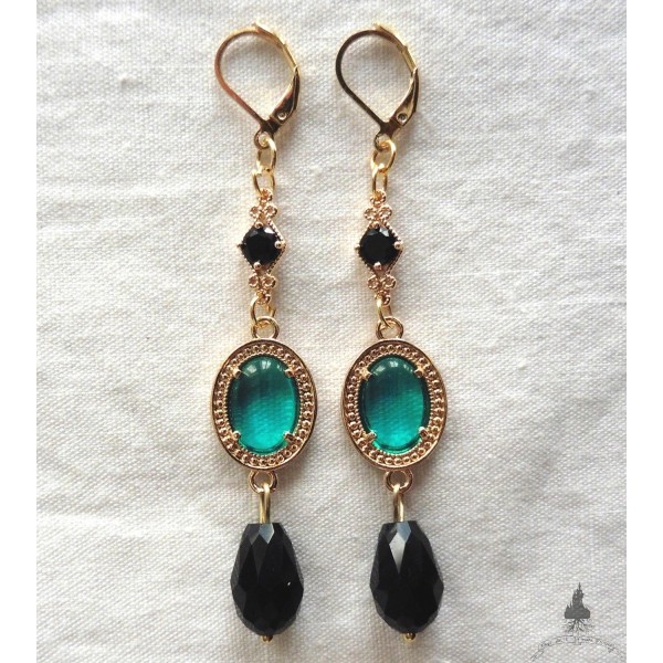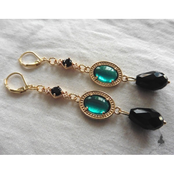 Petits pendentifs losanges en Laiton doré et verre noir surmontant de petits médaillons ovales en verre vert sertis sur Laiton doré.(le coloris vert est difficile à montrer en photo et selon la personne, vous le verrez vert plus ou moins soutenu avec parfois un aspect bleu turquoise).