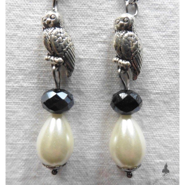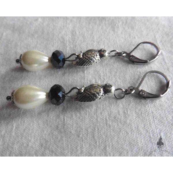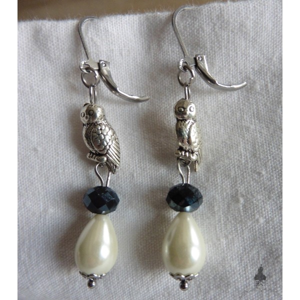 Boucles d'oreilles avec attaches crochets à leviers "dormeuses" et petits pendentifs chouettes en acier inoxydable argenté.