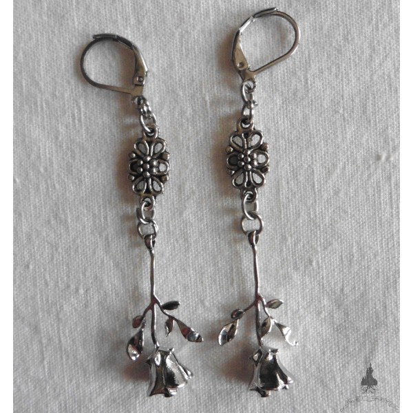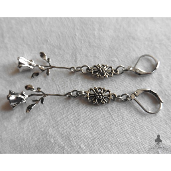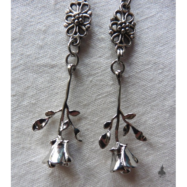 Délicate paire de boucles d'oreilles avec rose sur tige.