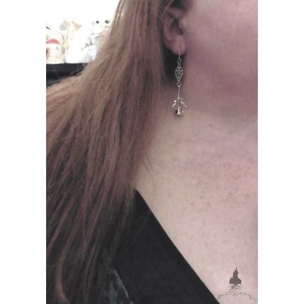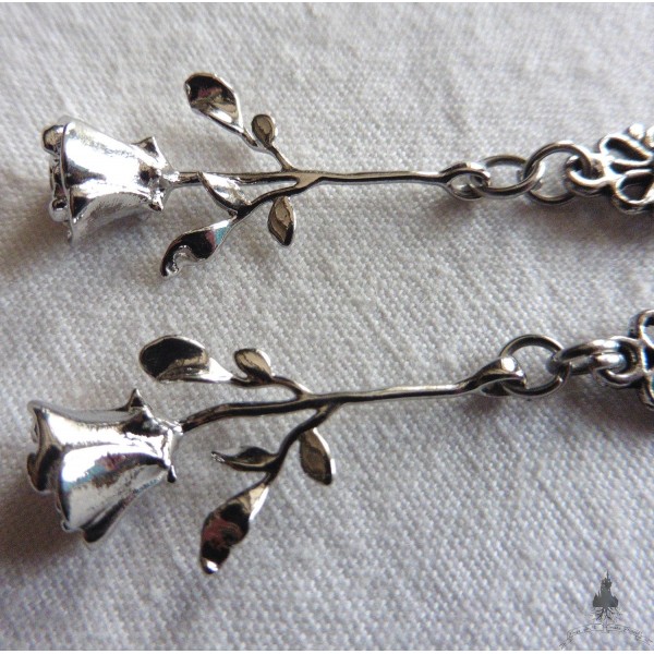 Pendentifs petites tiges et roses 3D inversées (chacune est différente), peu détaillées, en Laiton argenté surmontées d'une breloque fleur filigranée stylisée argentée.