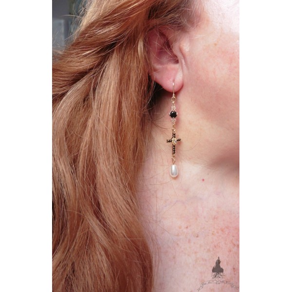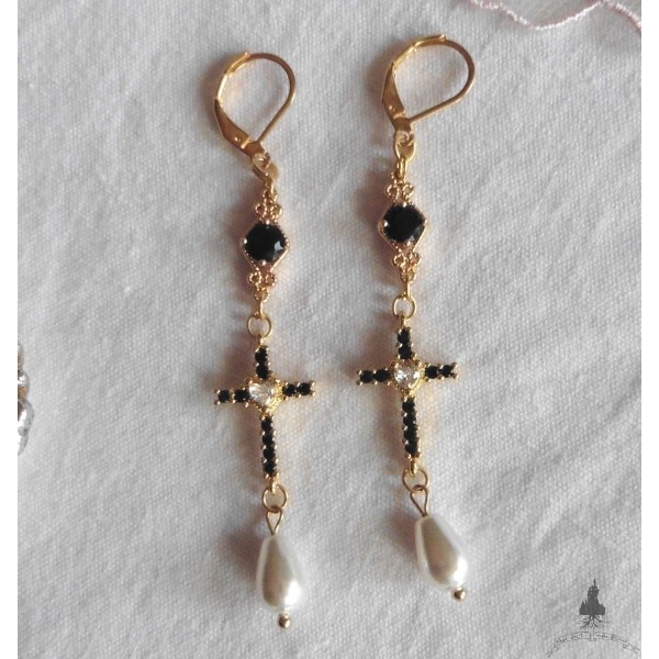 Paire de boucles d'oreilles de Reine façon Dark Romance avec pendentifs croix et perles.