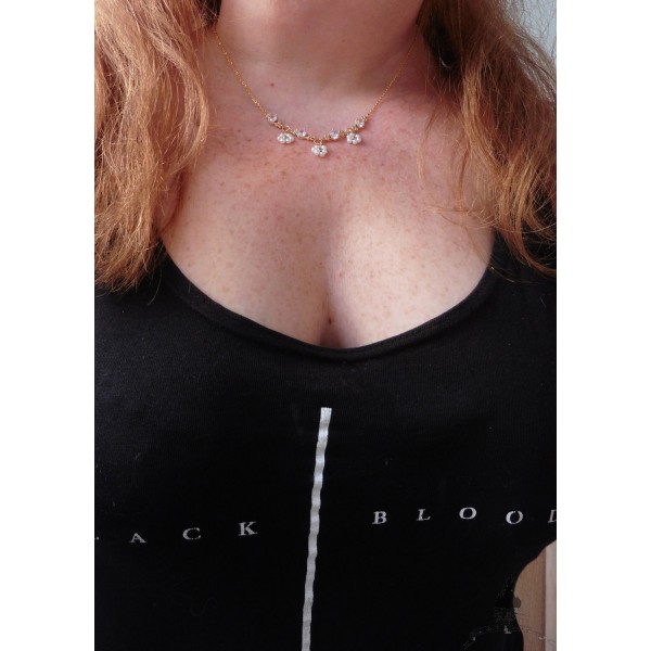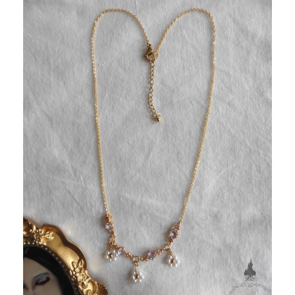 Collier ajustable avec chaîne en acier inoxydable doré et quatre petits pendentifs losanges en Laiton doré et verre blanc.