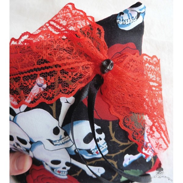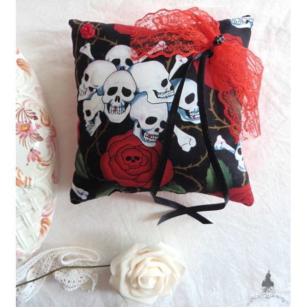Coussin d'alliances réalisé en coton imprimé crânes blanc et roses rouges avec feuilles vertes sur fond noir.