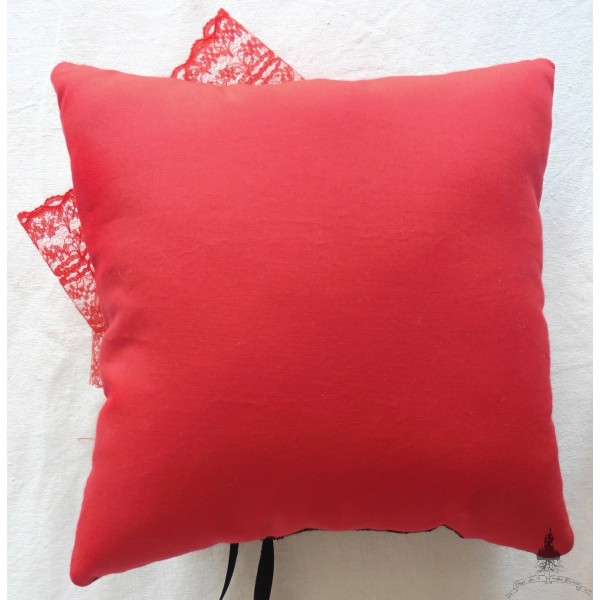 Coussin d'alliances gothique totalement unique, entièrement cousu et réalisé main sans machine, pour mariage rouge, noir, blanc.