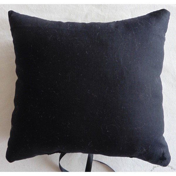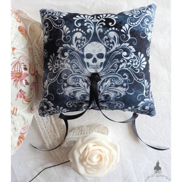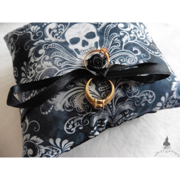 Coussin d'alliances gothique totalement unique, entièrement cousu et réalisé main sans machine, pour mariage noir, blanc ou gris.