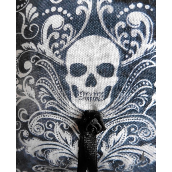 Coussin d'alliances réalisé en coton imprimé crâne blanc/gris et volutes sur fond noir/gris/anthracite délavé avec léger effet Tie and Dye.