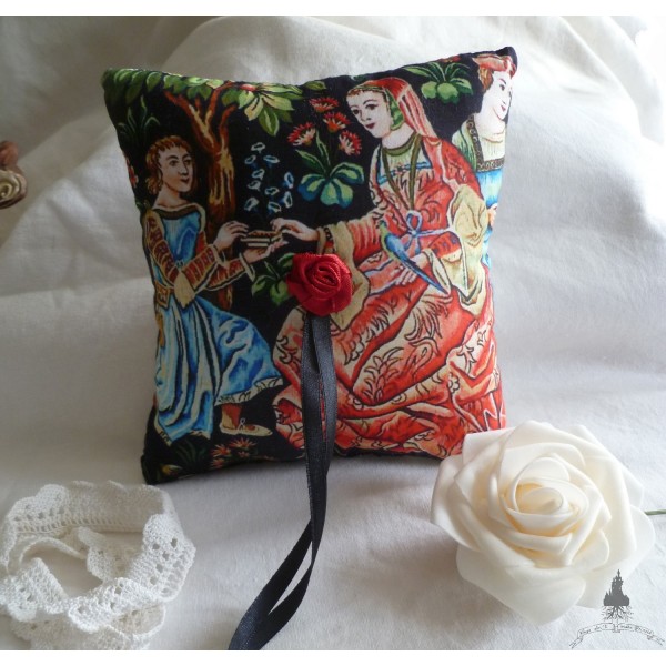 Coussin d'alliances réalisé en coton imprimé couple médiéval Renaissance, multicolore sur fond noir.