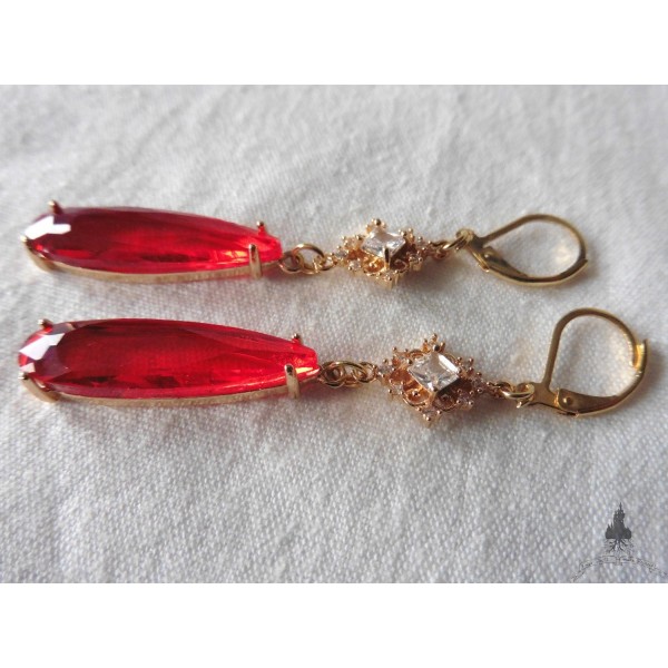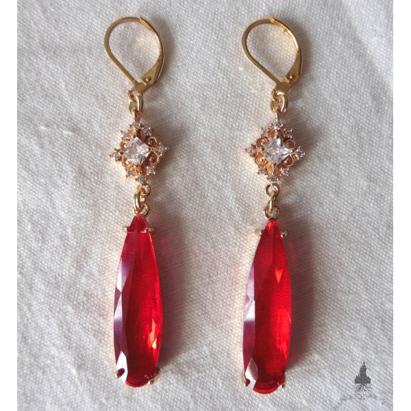 Larmes de verre rouge transparent, serties sur griffes en laiton doré.