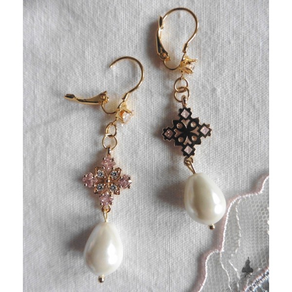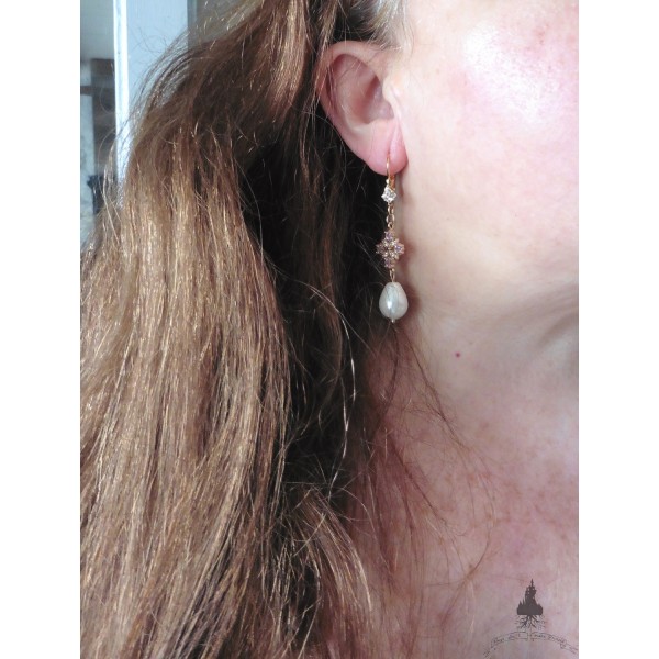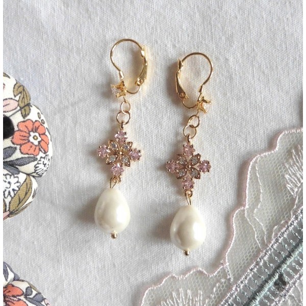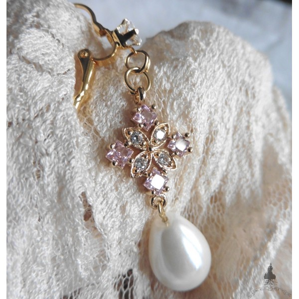 Pendentifs losanges Renaissance en Laiton doré pavé de zircons cubiques roses clairs et de petits oxydes de zirconium blancs formant une fleur au centre.