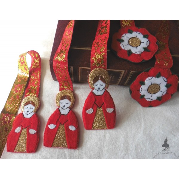 Reine Tudor et rose Tudor en feutrine rouge, vert, blanc et or.