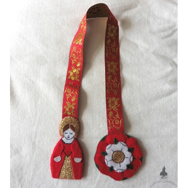 Marque-page textile avec ruban médiéval en polyester floral rouge et or avec l'envers en négatif doré.