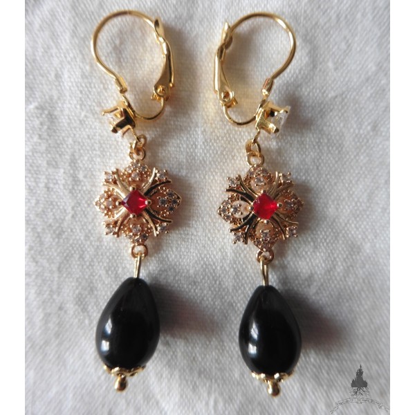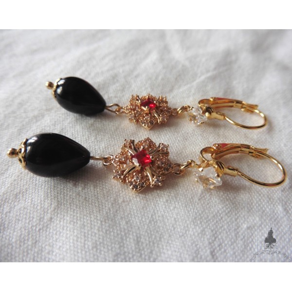 Paire de boucles d'oreilles royale, mais discrète, avec pendentifs Renaissance, pour cadeau, cérémonie ou mariage rouge, noir et blanc.