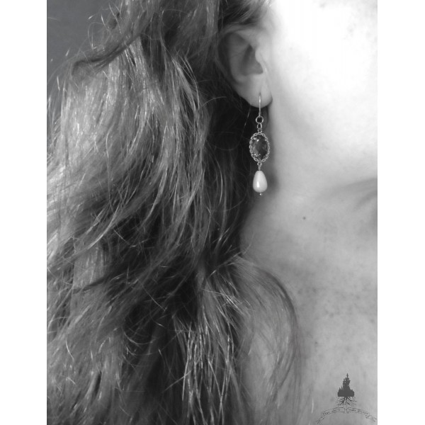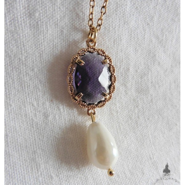 Pendentifs ovales avec bases en Laiton doré torsadé et cabochons ovales en verre à facettes violet transparent. Deux perles-gouttes en verre blanc écru/ivoire, nacrées synthétiquement.